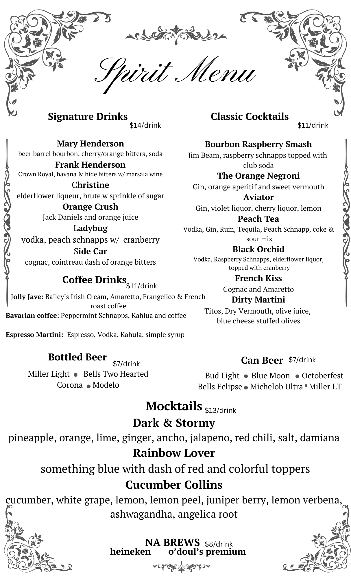 SPIRITS LOUNGE COCKTAIL MENU